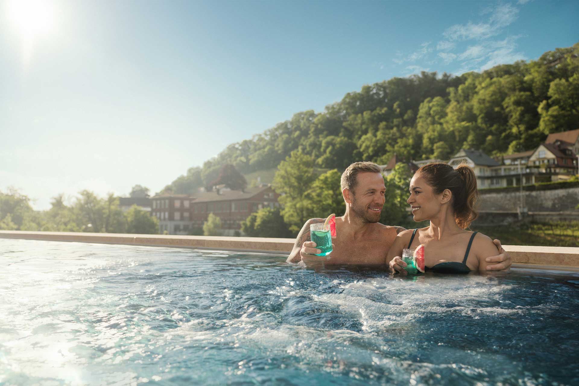So haben Sie den Feierabend bestimmt noch nie verbracht: Gemütlich auf der Sprudelbank liegen und ein Glas Rosé geniessen, mit Freunden im Whirlpool ein Bierchen trinken oder in Zweisamkeit bei einem FORTYSEVEN Spritz im Aussenpool die Aussicht bestaunen.